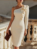 Mooyius presents a sculpted bodycon midi dress that blends refined elegance with artful asymmetry. This design features a striking one-shoulder silhouette enhanced by a cascading ruffle that adds soft dimensional movement along the neckline. A single long sleeve on one side creates a balanced, modern contrast, while a delicate embellished strap on the opposite shoulder adds a touch of sophistication. The streamlined, figure-contouring cut highlights the body’s natural curves, creating a polished look ideal for elevated occasions.