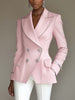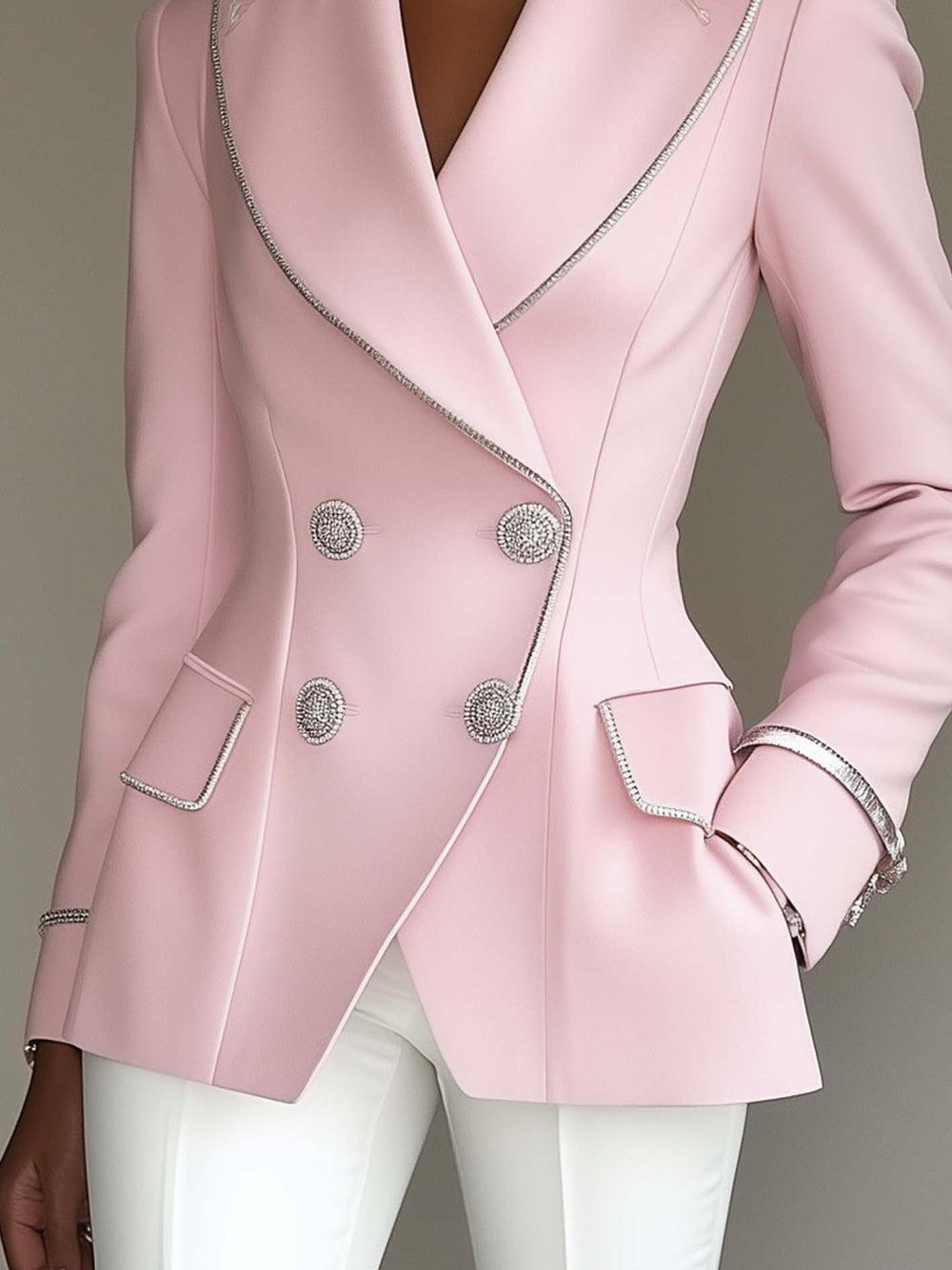 This pink blazer blends femininity with contemporary glamour, creating a piece that exudes polish and sophistication. The fabric’s slight sheen enhances the gentle romantic hue, while the sharply tailored construction introduces refined power dressing. The highlights of the design lie in the glistening silver accents: the rhinestone-inspired silver buttons and delicate metallic trim along the edges lend a jewelry-like effect, making the blazer almost accessory-like in its detailing.Its double-breasted front and broad lapels evoke classic suiting influence, but the shimmering details and pastel tone push it firmly into statement territory. Whether worn closed for a cinched-in look or open over a slip top, this blazer captures attention while maintaining exceptional elegance. It speaks to confident, fashion-conscious women who appreciate sharp tailoring combined with a soft, glamorous edge.