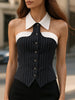 Mooyius presents the Pinstripe Top With Contrast Collar And Button Front to elevate your sophisticated look. Tailored for impact, this pinstripe corset top combines sharp tailoring with modern femininity. Crafted in a structured fabric, it features vertical pinstripes and a figure-enhancing cut. The standout elements include a contrasting white collar and upper trim, along with a full button-down front and pointed hemline.