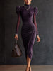 Make a glamorous entrance with this Plum Velvet Mesh Sleeve Draped Midi Dress. Combining the softness of velvet with the light elegance of mesh, this design speaks to a modern woman's strength and grace. The sculpted silhouette and artful draping create a rich visual texture, while puffed shoulders and sleek sleeves balance drama with poise.