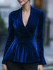 Mooyius presents the Blue Velvet Wrap-Front Peplum Blouse, designed for the woman who craves a blend of opulence and feminine sophistication. This blouse features a deep wrap-front V-neckline, a figure-flattering peplum hem, and elegant bell sleeves, all crafted from rich velvet fabric that exudes luxury.