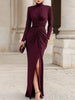 Mooyius presents an elevated evening gown designed to embody refined glamour through thoughtful draping and architectural shaping. This long-sleeve silhouette features a structured high neckline balanced by a meticulously ruched bodice and waist that sculpt the figure with couture-inspired precision. A dramatic front slit adds movement and allure, while the gown’s fluid drape ensures an elegant, elongated profile from every angle.