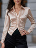 Mooyius introduces an elevated satin blouse designed to bring refined sophistication to everyday dressing. This long-sleeve top features a soft luminous surface with a subtle sheen, shaped into a tailored silhouette that enhances the figure without restricting movement. The highlight of the design is the ruched placket detailing, running along the button line to create a feminine, sculpted texture that adds depth and dimension.