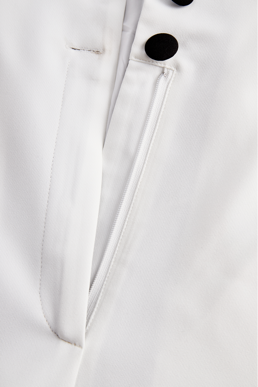 Make a lasting impression with this white tailored jumpsuit featuring elegant dual buttons and a glossy satin lapel. The sharp silhouette accentuates the waist, while black side panels provide a subtle slimming effect.