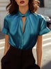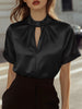 Elevate your style with this elegant white satin blouse, featuring a high neckline with a knot accent and a chic keyhole detail. The short cuffed sleeves and relaxed fit make it perfect for both office wear and casual outings.