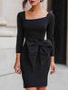 The clean square neckline frames the collarbone with architectural precision, complemented by streamlined three-quarter sleeves that balance elegance and wearability. The dress follows a tailored sheath silhouette, shaping the body with subtle structure for a sophisticated, elongated profile suited for evening occasions, upscale gatherings, or impactful daytime styling.