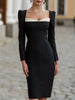 Mooyius introduces a refined square-neck midi dress designed for modern professional elegance. This silhouette highlights clean architectural lines, featuring a structured neckline accented with a contrasting bandeau insert that subtly enhances the décolletage. The tailored bodice contours the frame, while the long sculpted sleeves and defined shoulder shape create an elevated, confident profile.