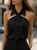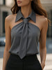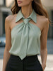 Mooyius presents the Stylish Sleeveless Halter Blouse with Neck Tie Detail to elevate your sophisticated look. Make a statement with this sophisticated khaki halter blouse, featuring a unique built-in tie knot at the neckline and a structured collar for a tailored finish.