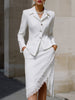 Complementing the blazer, the asymmetric skirt introduces a touch of softness with its overlapping front panel and delicate lace trim peeking from the hem, adding subtle texture and movement to the look. This set blends confident structure with romantic elegance, creating a versatile outfit suitable for high-level meetings, formal events, or upscale daytime engagements.