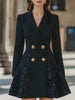 This tailored blazer dress blends refined structure with fluid movement, creating a sophisticated silhouette suitable for modern professional and evening wardrobes. The dress is designed with a sharp double-breasted bodice that provides clean architectural lines, enhanced by four sculpted gold-tone buttons that serve as polished focal points.
