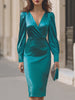 Embrace unparalleled glamour with our Teal Satin Deep V-Neck Puff Sleeve Midi Dress. Crafted from luxurious, glossy satin fabric, this dress features a alluring deep V-neckline, dramatic puff sleeves for a touch of vintage charm, and a body-hugging midi skirt that accentuates your curves flawlessly.