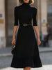 Exude refined elegance with our Timeless Black Mock Neck Pleated Midi Dress. Crafted from premium structured fabric, this dress features a chic mock neck and elbow-length sleeves, creating a polished silhouette. The waist is cinched with a sleek black belt adorned with a gold-tone buckle, sculpting a sophisticated hourglass shape.