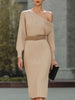 Reign Over Day and Night with Effortless Sophistication in our Camel Knit Asymmetric Elegance Dress. Crafted from sumptuous ribbed camel knit, this dress features a chic one-shoulder neckline that showcases the collarbone and creates a striking silhouette. The bodice drapes elegantly and is cinched at the waist with a textured woven belt, sculpting a refined hourglass shape.