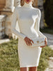 Mooyius presents a refined ribbed knit mini dress crafted with a balance of minimal elegance and delicate detailing. The silhouette features a high turtleneck that frames the neckline with clean sophistication, complemented by long fitted sleeves for a sleek, elongating effect. Feminine touch without overwhelming the streamlined design. The body-skimming fit enhances the natural contours while maintaining a polished, modern aesthetic, making this piece ideal for both daytime refinement and evening elegance.