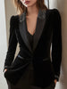 Crafted with attention to detail, the blazer features a slim-cut fit that beautifully accentuates the waist, while the single-breasted front maintains its classic appeal. The soft velvet fabric offers a rich, opulent look, making it ideal for evening events, cocktail parties, or elegant dinners. The beaded collar adds a modern twist to this timeless piece, ensuring that it stands out in any setting.