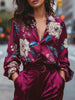 Elevate your wardrobe with this elegant satin blouse in a burgundy shade. The intricate floral print adds a pop of color and femininity, making it ideal for pairing with tailored pants or skirts for a polished look.