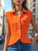 Mooyius presents the Vibrant Orange Sleeveless Blazer Top to elevate your sophisticated look.Add a pop of color to your wardrobe with our vibrant orange sleeveless blazer top. Crafted with precision, this chic piece features striking gold button detailing and a sharp collar, offering a sophisticated and modern appeal.