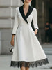 Mooyius presents the midi dress is crafted to embody vintage charm and refined sophistication. Featuring a bold black-and-white contrast design, a dramatic shawl collar, 3/4 sleeves with black cuffs, and a black lace hem, it blends retro aesthetics with modern tailoring. The A-line silhouette and cinched waist accentuate feminine grace, making it a standout choice for elegant events.