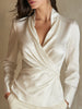 Long fitted sleeves complement the structured silhouette, while the wrapped waist design creates a polished yet feminine shape. With clean lines and smooth contours, this blouse embodies wardrobe luxury in its most refined form. Perfect for formal meetings, elevated workwear, or elegant social settings, this versatile piece pairs flawlessly with tailored trousers, pencil skirts, or wide-leg silhouettes.