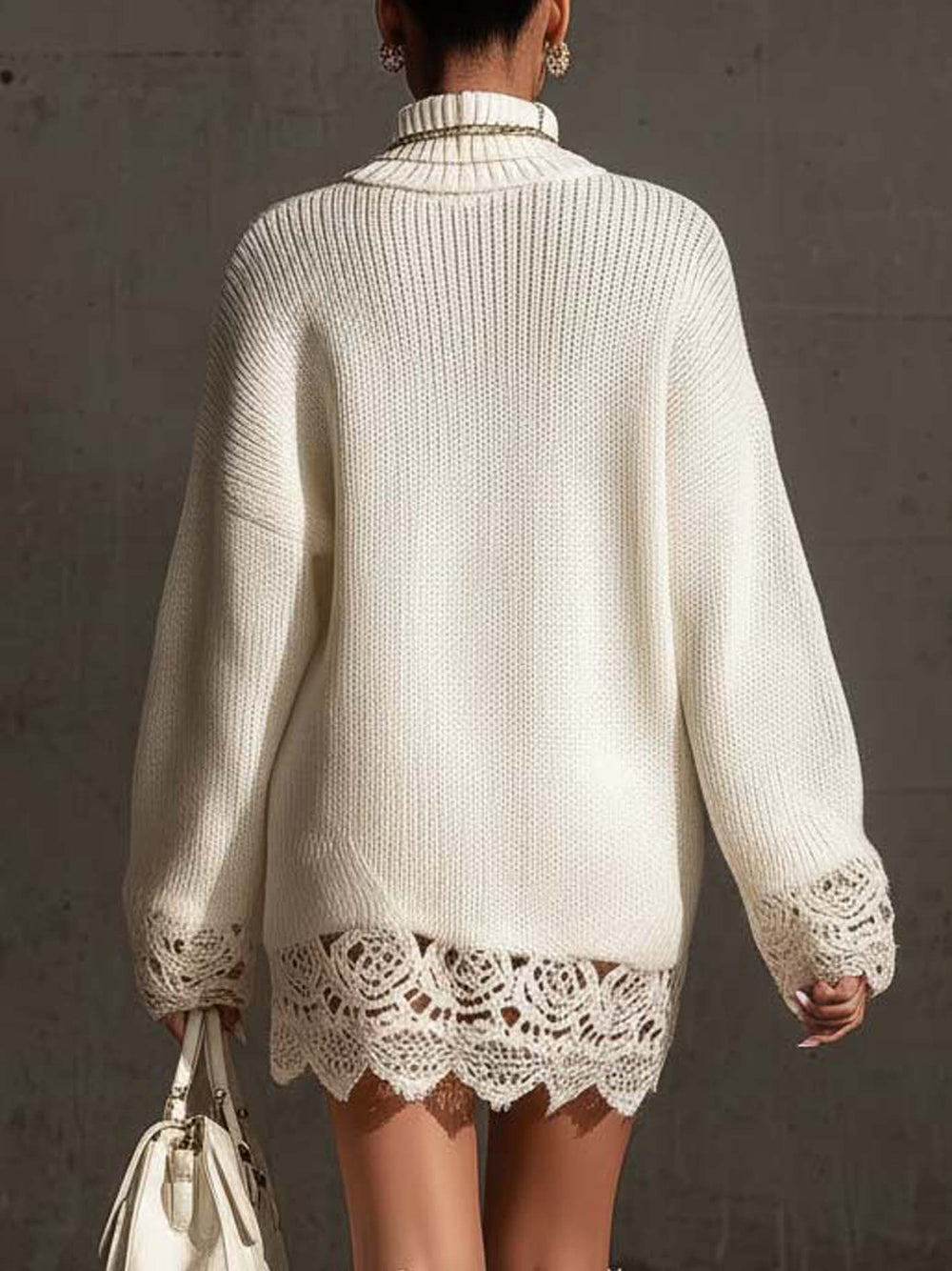 This white turtleneck knit mini dress embodies a luxurious balance of warmth and softness. The oversized knit gives a modern cozy appeal, while the lace trim adds sophistication and romance. The combination of tactile textures — chunky yarn and delicate lace — creates a visually rich, elegant statement piece perfect for cool-weather style.