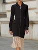 The structured collar and long sleeves add refinement, making it appropriate for both elevated daytime settings and evening engagements. The highlight of this design lies in its contrast fringe hem—an elegant ivory-toned fringe that adds movement, dimension, and a striking visual balance to the deep black body.